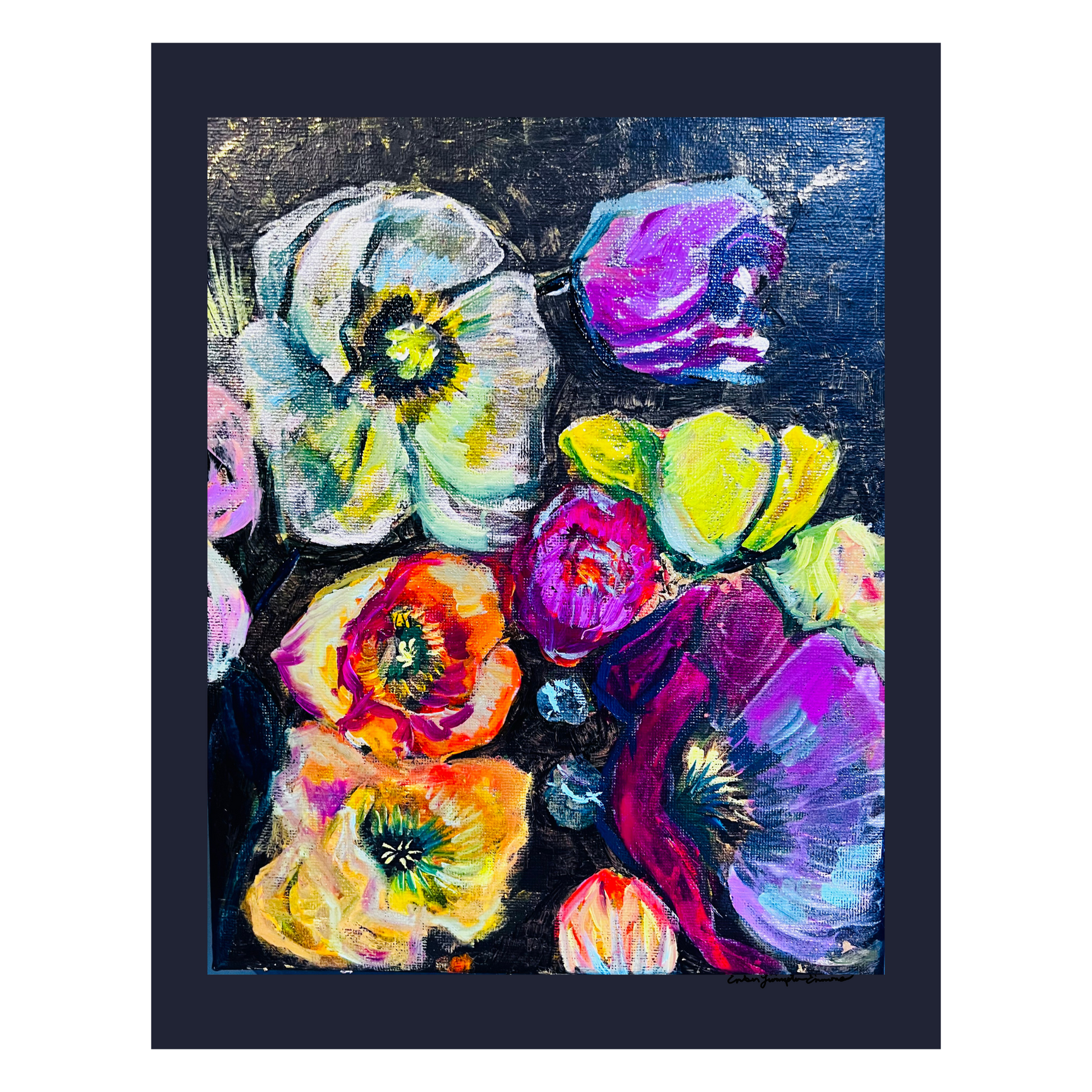Luminous and layered, “Gold Poppies” captures a bouquet of late-summer blooms in rich, expressive brushwork. Painted in Sitka, this piece celebrates the ephemeral brilliance of petals in full bloom—wild, fleeting, and forever golden.