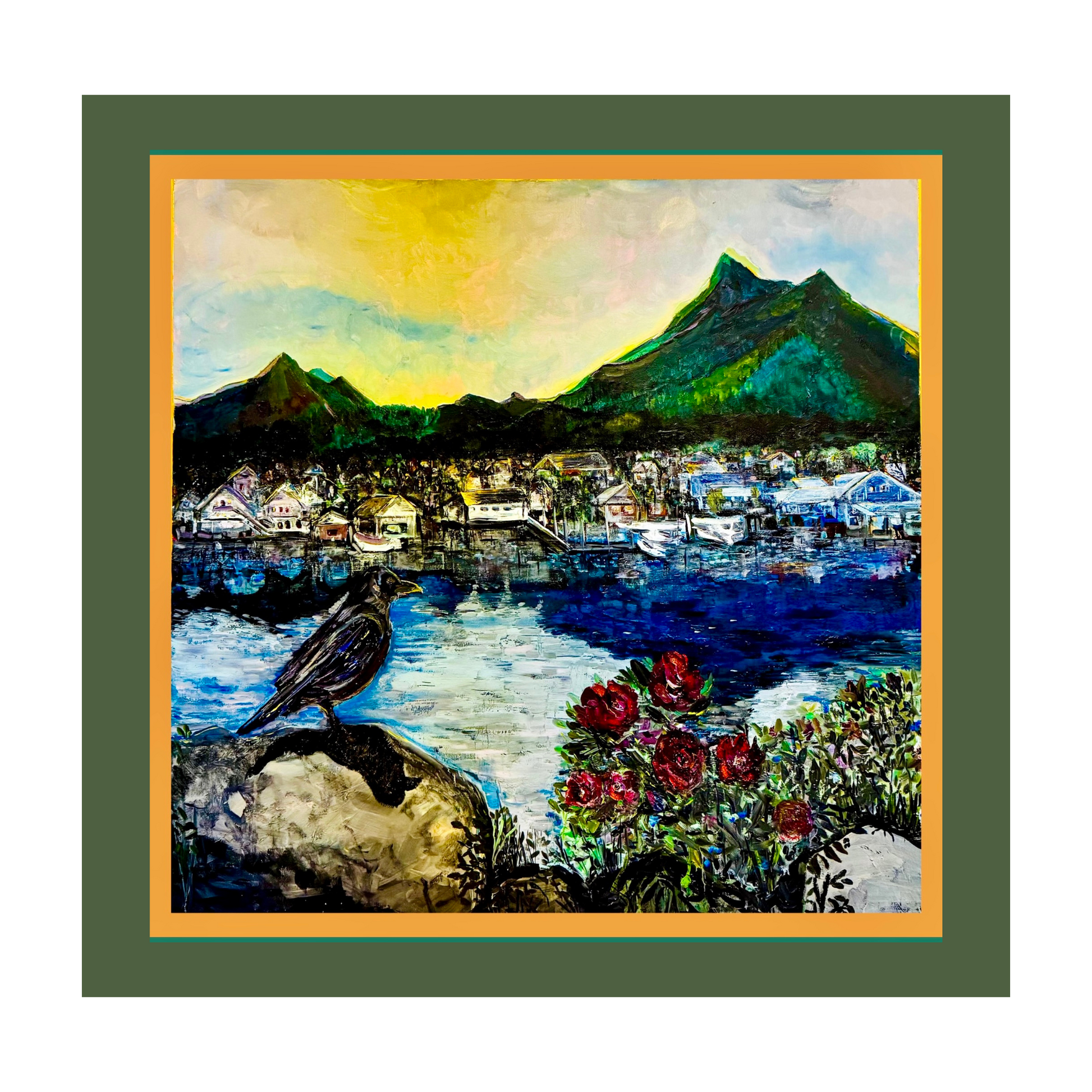 A watchful raven surveys Sitka’s harbored coast in The Guardian, a bold and atmospheric piece that weaves Alaskan landscape with mythic symbolism. The raven—often seen as a messenger or protector—stands sentinel over a golden-hour view of town and sea. Painted in Sitka, this work evokes both reverence and resilience.
