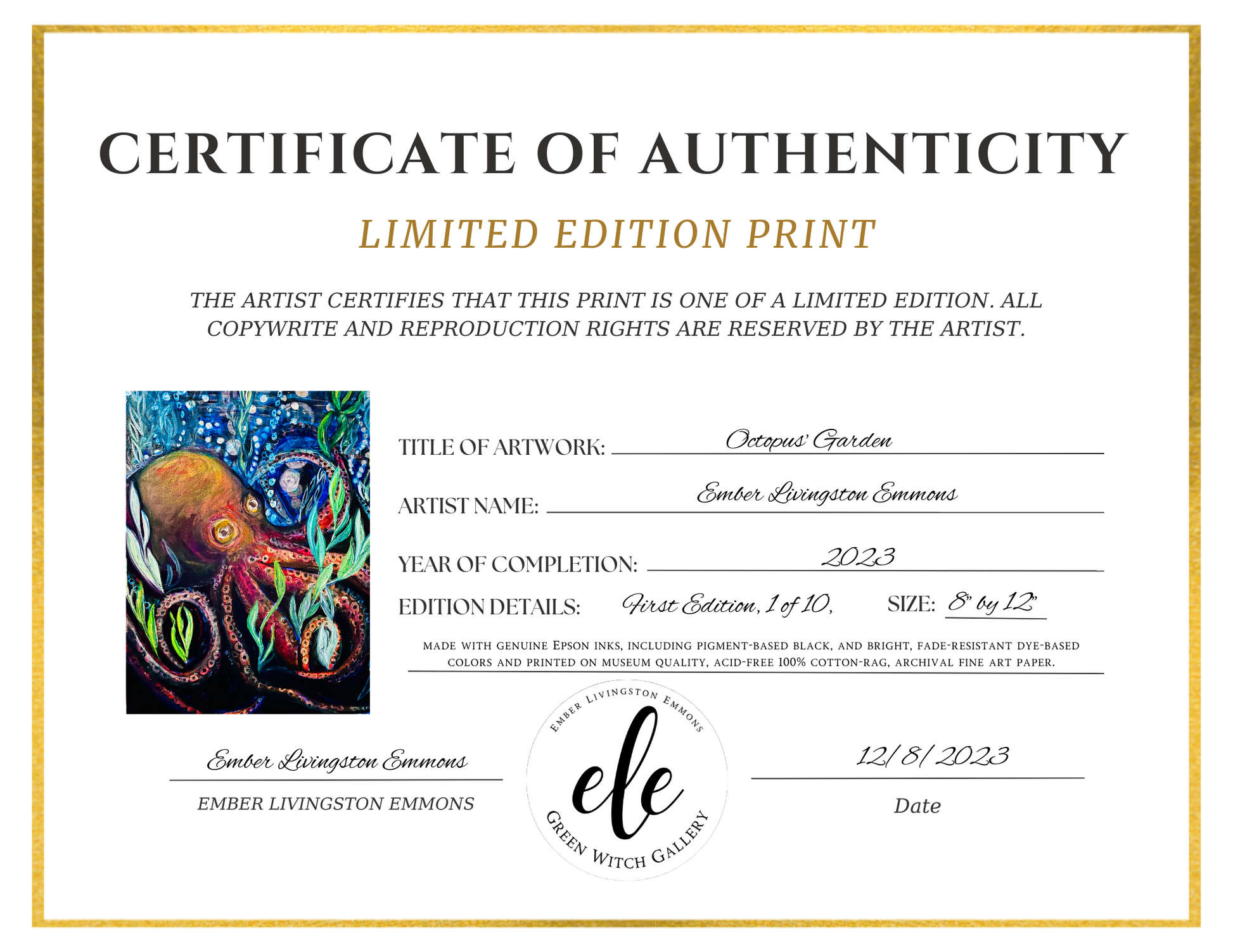 Prints are made with genuine Epson inks, including pigment-based black, and bright, fade-resistant dye-based colors and printed on museum quality, acid-free 100% cotton-rag, archival fine art paper. Prints are signed and include a certificate of authenticity.